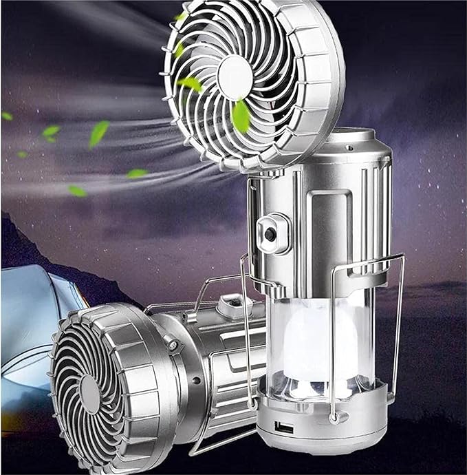 Multifunctional Design: Combines a camping lantern, fan, flashlight, solar charger, and rechargeable light, providing versatile functionality for outdoor adventures.