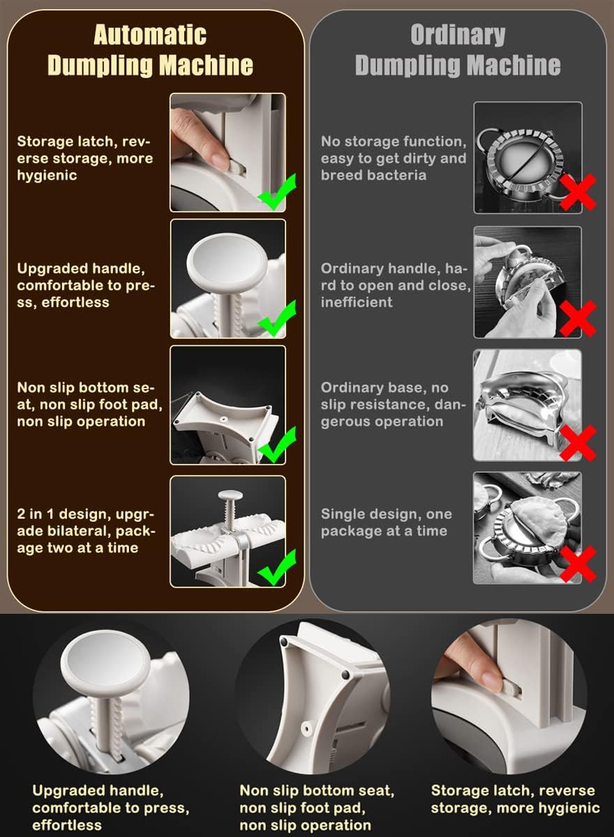 Functionality: Automatic and quick operation for making various types of dumplings, samosas, ravioli, pierogi, pies, empanadas, and more